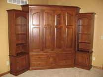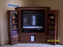 This quarter sawn oak media cabinet was designed to fit into the corner of a room. It has Bi-fold doors which can be folded and pushed back into the cabinet. Two smaller side shelves are perfect for storing books or displaying collections. It can be made out of any wood and stained any color.
