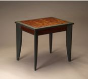 This side table features a top of figured mahogany with hand-carved and milk-paint finished edging of ash. The ash legs are shaped by hand and also finished in milk paint.