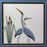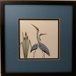 My beautiful quilled Double Herons design is double matted and framed in a 12" x 12" wood black frame as shown, with rolled paper cattails to enhance the scene. This design looks wonderful when hung alone or together with two other of my heron designs for a dramatic wall collection. This is my original design and made exclusively by me in my New Hampshire Studio. My Heron designs are the perfect gift for the man in your life. You can choose the Heron Turned, Heron, Heron in Flight, Heron Fishing, or even the Heron Pair. And they are all matted and framed the same so they make perfect sets. I also can frame and mat to match your home decor. Just ask. This is my double Heron, but I can design any of my WildLife Birds or Ducks, or even a couple different flowers to have two in the same design. That is custom made, your way. Let's talk about it. What is Quilling? Quilling is a very old craft. Its name comes of the old practice of trimming the gold edges from books, and then winding the narrow strips of paper around feather quills, using the quill for the tool. Once rolled into circles and pinched into various shapes, the paper is used as texture and detail in pictures. My own technique uses the quill work as a background and details to cut-outs of wildlife. The quill work simulates the feathers in the duck and birds, the scales on the fish, the veins in the wildflowers, and the fur on the moose.A little more information about my work -- I do everything from the beginning to the end of each and every piece…Just Me. I start with the design work, the cutting of the overlay with an exacto knife, the rolling of the quilling paper, by hand, the glueing, the cutting of the mats, the cutting of the glass, the putting-it-all-together in the frame under glass, the photographing and all the website work. Thanks for checking out my portfolio. I look forward to working with you for that special custom piece.