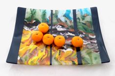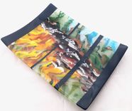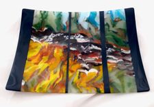 The warm palette of the arroyo was the inspiration for this contemporary platter. It is made of hand raked fused glass which gives the piece a painterly feel. Bands of deep blue aventurine add a graphic element for visual balance. The platter has a gentle curve for a modern look. It is food safe and meant to be used and enjoyed. It should be hand washed and is not for use in the microwave. The approximate measurements are 16.5" x 12".