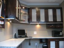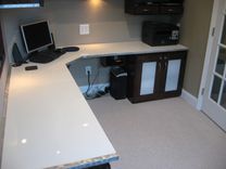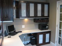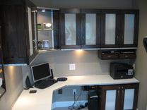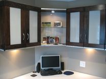 This custom instillation was commissioned by a client for his office in Downtown Atlanta. Equipped with under counter lighting, glass display shelving, file cabinet, and cabinet storage. The white acrylic table top makes for a bright work area also counter height power/data outlets to truly create a productive space.