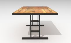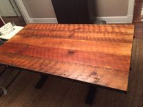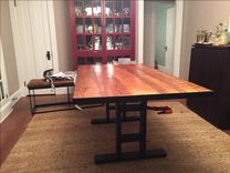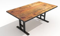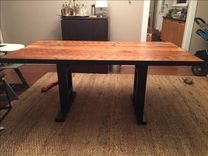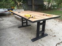 This table mesaures 6ft x 40" and is made of reclaimed pine board and metal. The reclaimed wood is hand planed just enough to make it smooth yet retain the character of the wood. The base can be custom designed and paint color can be changed upon request.