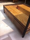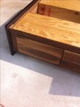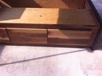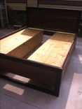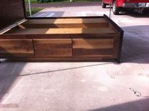 This is a ultra modern Queen platform bed with black edging on the headboard and footboard. Beautiful sappy walnut everywhere else. Each platform has 3 drawers and hand made walnut dowels to cover screws on the sides. The base and footboard show off the "floating" aspect of this piece. Your queen bed ships for free in the lower 48. Looking forward to your special order(please allow 4-6 weeks for delivery)-Terry contact me if you would like a different material:)