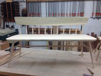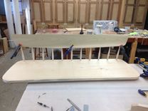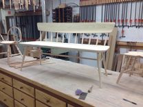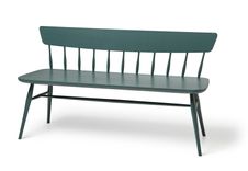 This wonderful bench seats 2 very comfortably. Made from maple and pine and colored with a Mediterranean teal finish. This contemporary Windsor bench has sleek lines and a fantastic feel.