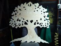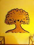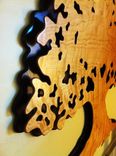 Layered Oak Tree Silhouette Back piece of the project is 1/2" oak stained dark brown. The front piece is 1/4" birch stained natural to showcase the beautiful grain patterns in this particular piece of wood. The front piece is extended off of the back using 1" aluminum spacers to provide depth and dimension. Individual pieces were all sketched cut, sanded, finished and assembled by the hand of one man. Doesn't get much more custom than that! The project is not just someone's business logo but a piece of art with a message. Taking a two dimensional picture and turning it into a three dimensional piece of art can be a challenge, but the end result is always more than worth it!