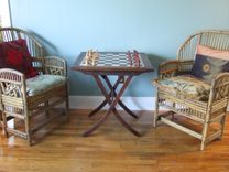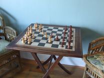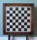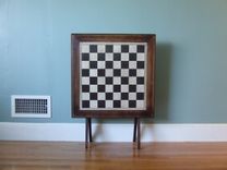 This is an example project. The piece pictured has been sold. Folding Chess Table by Banksville79 Using a salvaged, vintage, wood folding table we rescued from our local Swap Shop, Steve removed the old, damaged inset top and replaced it with his hand-cut and painted 1/2" Masonite chess board. We protected the chess board with 3 coats of matte finish polyurethane and cleaned up the table, but retained the rich patina and vintage look. The results are a fantastic upcylcled folding chess table! As you can see from the pictures it is the perfect height for gaming, and it folds up neatly to store flat against the wall. When opened for use it is remarkably stable and sturdy. Dimensions: Square size 2.5" Table height 27.25" Table top 27" square (Chess pieces are not included.) Please contact us with any questions. Thank you!