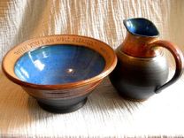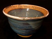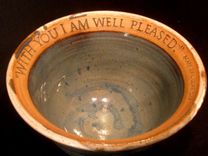 Large baptismal font and pitcher set made from wheel-thrown stoneware clay. Inscribed with "With you I am well pleased. Mark 1:11, Luke 3:22", reflecting the voice of God heard at Jesus' baptism. Font is approximately 10-12 inches wide at the top, and pitcher is approximately 8-9 inches tall. First photo is Sandstone, Espresso, and Floating Blue glazes. Second and third photos are Denim Blue, Floating Blue, and Waxy White glazes.