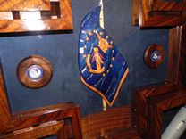 The General's Guidon was one of the most intricate pieces I've built in recent memory. I was asked by some friends to build a going-away gift for our outgoing commander, tossed around some ideas, and settled on a multi-section shadow box that contained a carved model of the Wing's guidon (flag), along with four bits of memorabilia from our various organizations (decoy, bomb fragments, blown up airplane). Every section was built from black walnut and used variably spaced dovetails on each corner for strength, since the unit would need to be shipped across the country. The four smaller boxes increase in size and are all different depths to accommodate their contents, requiring individual settings on the dovetailing jig. Once each box was constructed, I added mitered face frames to the front using highly figured walnut strips. The flag was scrollsawn from cherry, then shaped and dyed to match the actual article. Also on the inside are coins from the Wing's Commander and Chief Master Sergeant, both of which are mounted on wooden discs that were turned on a lathe and individually sized to fit. Small stands were added to let it be set on a mantle and the back of each box is lined with blue suede fabric. Once construction was complete, it was finished with medium walnut stain and oil polyurethane.