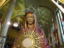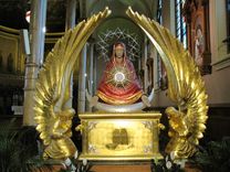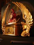 It is a great joy to be able to work materializing a vision of a good friend. From the first suggestions to the full realization of the idea – step by step we build what you now can see. Each detail had a lengthy time of development through numerous prototypes. The massive gilt-wood monstrance is widely thought to be the largest in the world, standing at 9 feet and weighing in at 900 pounds. It is the work pf Stefan Niedorezo. The design is original, though not unprecedented, drawing on eastern images of Our Lady of the Sign and numerous other theological, iconographic and scriptural sources. It consists of a half-length sculpture of an orante Virgin Mary that serves as the backdrop for a foot-wide luna surrounded by rays and a crown of thorns. The statue is flanked by angels, and raised on a base resembling the Ark of the Covenant.