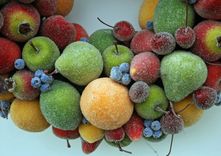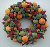 Fruit galore!!! There is no shortage of fruit in this stunning wreath. A lot of time and detail went into this creation. Each piece of faux fruit is hand "sugared" by me with glass microbeads. You will find strawberries, cherries, limes, apples, pears, pomegranates, blue berries, lemons, and oranges. The only greenery used in the piece is the stems attached to the strawberries. This Christmas wreath packs a huge visual punch with details and is sure to delight. By adding creative lighting the entire wreath shimmers and sparkles! The base for this wreath is styrofoam hand wrapped in moss attached with glue and floral wire. The circular wreath measures approximately 15 inches in diameter and should be used indoors or in a sheltered area away from the elements. This piece can be used as wreath or as a center piece and would look beautiful with a large chunky candle placed in the center opening which measures approximately 4 1/2 inches in diameter.