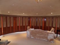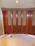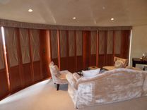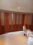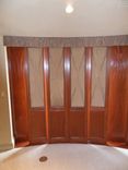Sliding panels in stained African Mahogany with upholstered insert. The panels, 16 in total, are used to cover 4 french doors leading outside onto the master bedroom terrace; existing walls between the doors were also covered with mahogany.