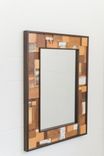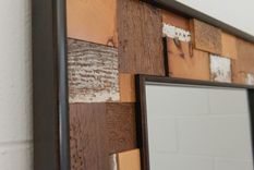 Hundreds of unique Iowa Barnwood pieces cover this framed mirror. Slices of barn timbers and cuttings from painted siding all adorn this one of a kind mirror.