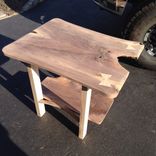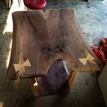 This project was an amazing piece. I wanted to design something "differant". the legs have a slight taper and are made of hard maple. And the top has amazing character. The top was glued up book matched to make the grain flow nicely through out the top, with two butterfly joints to hold old moisture cracks together. Deciding to make less legs and more top really fit this piece well.