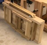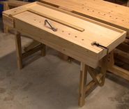A portable workbench made of poplar, built entirely with hand tools. Folds for storage and travel. Ideal for a small workspace, on-site work, or travel to craft shows and demonstrations. Suitable for a variety of creative work: woodworking, metalworking, jewelry making, leatherwork, stained glass, graphic arts, electronics, etc. Can be customized to any height, width, and depth, including size of tool well. Can accommodate a variety of work-holding devices. This one is setup for woodworking, with holdfast, crochet planing stop, planing battens, and adjust clamping dog.