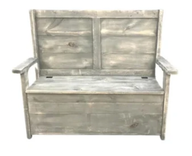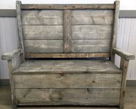 This wonderful bench is perfect for entryways or the front porch. This bench has been hand crafted from barn board and finished in a weathered gray driftwood stain. The seat lifts to reveal ample storage. Available as our standard piece or customizable to your own dimensions and colors. Dimensions: W55" x H46.5" x D20" Please message me ahead of time for custom color or dimension requests. -Jeremy Edward, The Crabby Lion