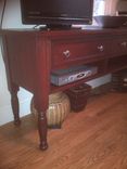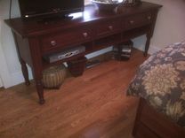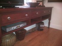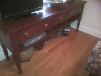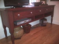 Solid cherry console table with turned legs. Lots of storage. Great for media gear or for serving in the dinning room.