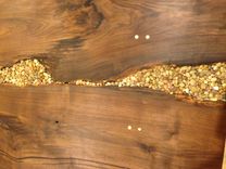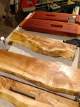 Live edge counter height (34") Dining table. Old growth live-edge Western Walnut, Live edge Curly Maple, and Paduk. The table is between 34-36 inches wide and 5'8" long. Every piece of the table is 8/4 or 2" thick. The middle of the table has been filed with tumbled river rock. The weight is about 450 pounds.