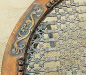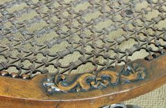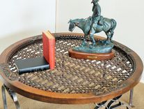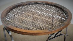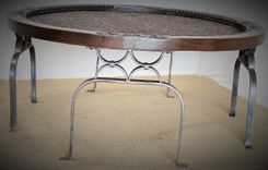 This coffee table will look good in your home, office, cabin or lake house. Combined with the end tables under a separate listing makes an attractive set. The center portion of the table is imported from India and was hand made from true wrought iron in the 1800's. The wooden border is hand crafted and was added to the iron piece some time later. We cleaned up the wood and added a finish to preserve the piece. The legs were made in our shop starting with straight flat bar, heating it in the forge and bending it to shape using anvil, hammer, vice and jigs. The wrought iron has only been cleaned with a nylon brush to keep the existing patina. The wood has been cleaned and sprayed with a clear coat enamel. The legs have two coats of Renaissance wax to preserve and help protect them. They will need to be waxed occasionally as the need arises. This is a one of a kind item and cannot be duplicated. The item shown in the picture is the only one we have. The table is 43" in diameter and 19" tall. The wood is approximately 3" thick. It weighs in at approximately 40 pounds. Please contact us regarding shipping costs. Depending on location, there may be various options available. We normally ship FedEx Ground.